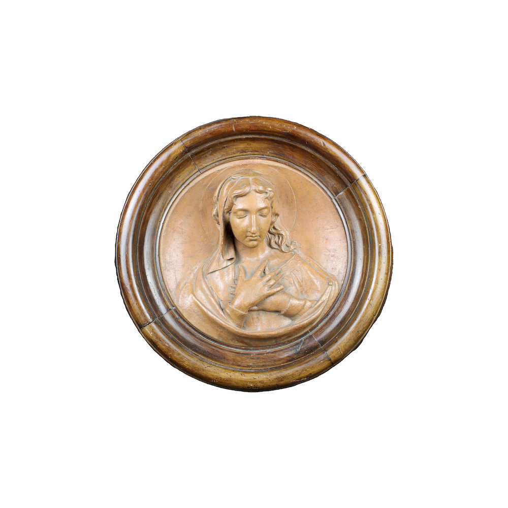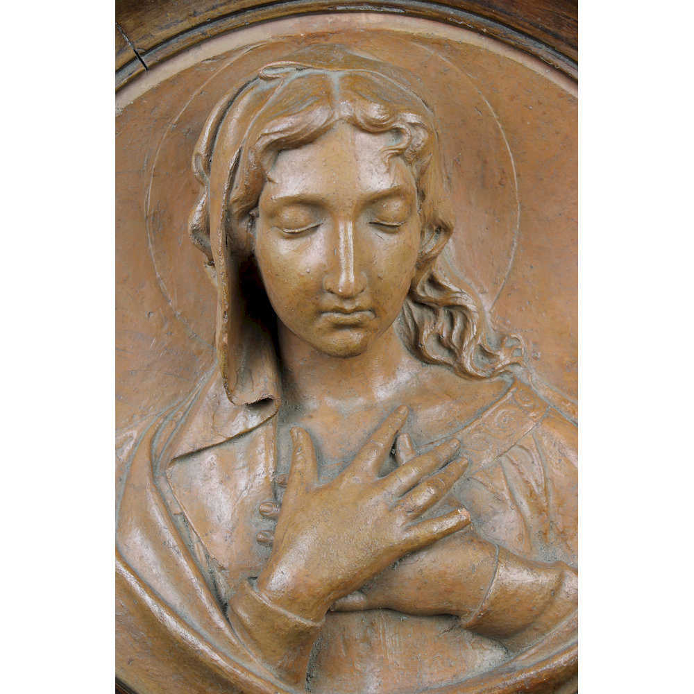 IMPORTANTE PLACCA AD ALTORILIEVO raffigurante madonna in terracotta dentro cornice in legno di noce attribuibile allo scultore Mario Rutelli Palermo 1859-1941