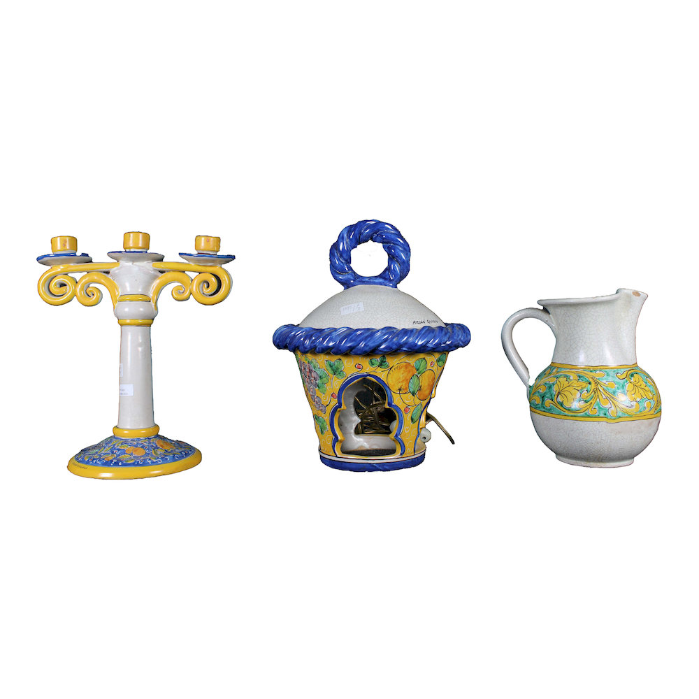 LOTTO COMPOSTO DA 1 lampada, 1 candeliere ed 1 ciotola in maiolica policroma manifattura Nicolo Giuliano XX secolo h cm 32 / h cm 20 / h cm 20
