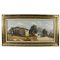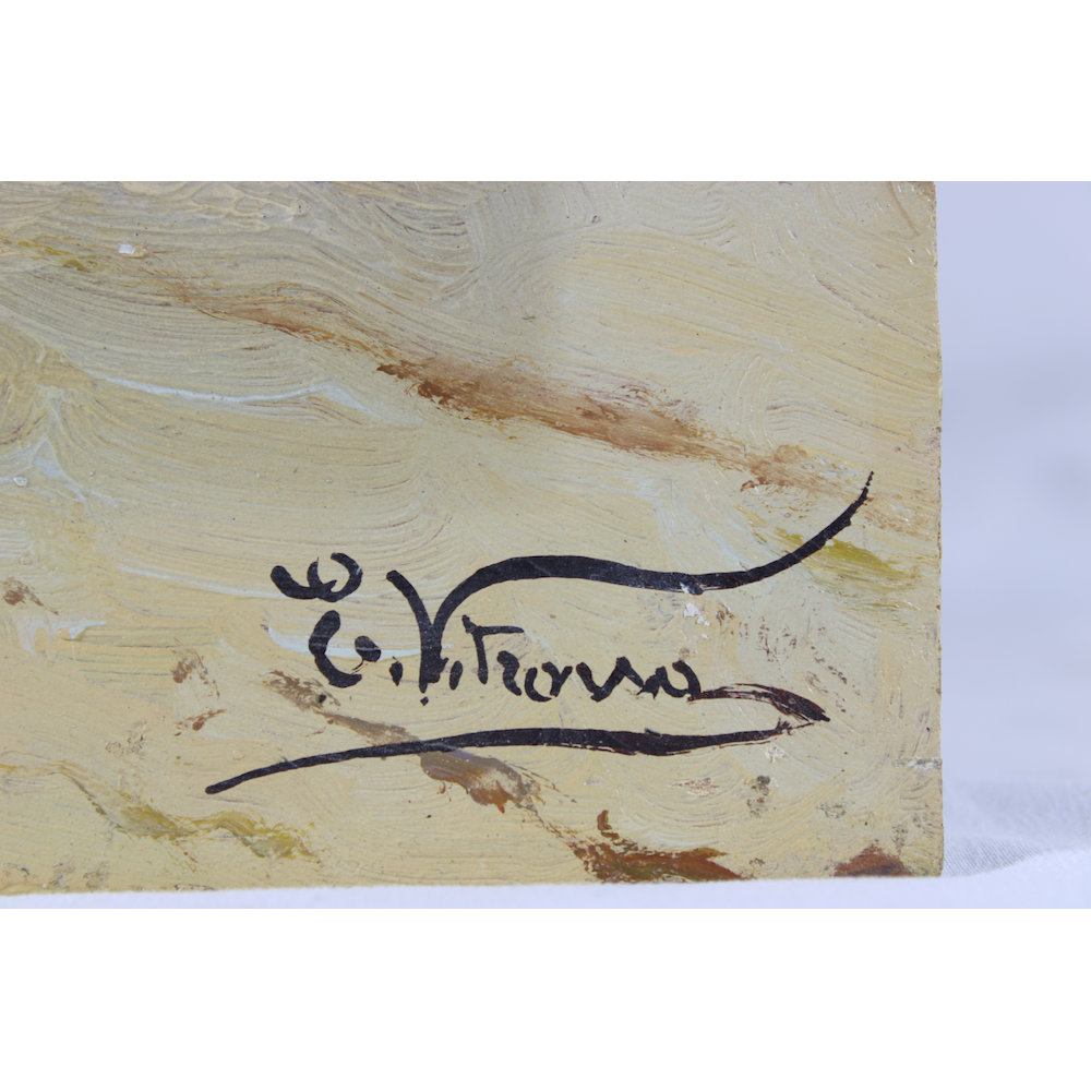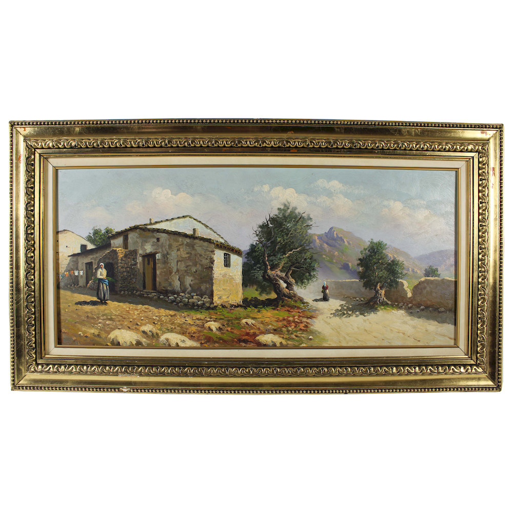 DIPINTO OLIO SU COMPENSATO raffigurante scorcio di paese con ulivi e personaggi a firma Vincenzo Vitrano 1907-1974 dentro cornice in legno dorato h cm 40 x 84 / cornice h cm 54 x 97
