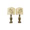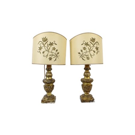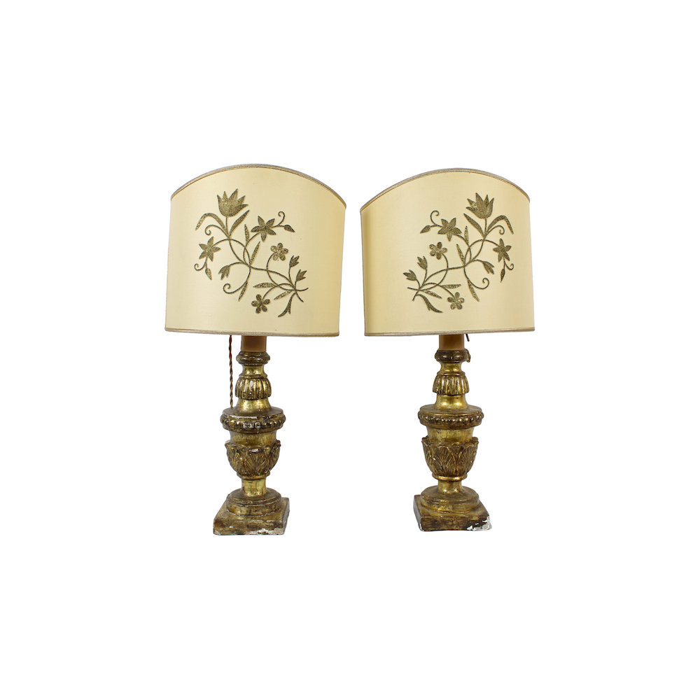 COPPIA DI PIGNE in legno tornito scolpito e dorato ad argento e mecca montati a lume con paralumi in tessuto ricamato a motivi floreali Sicilia XVIII secolo h cm 60 x 30 x 22