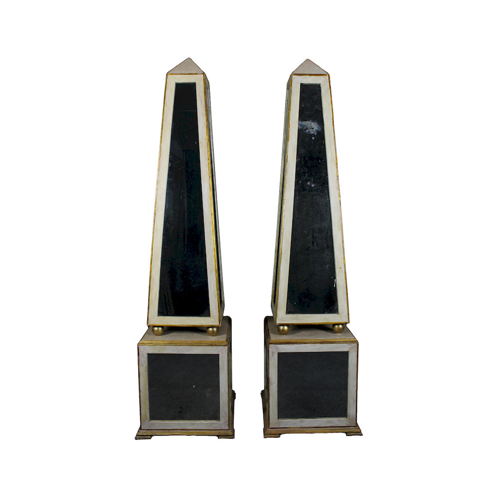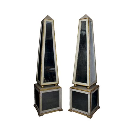 COPPIA DI OBELISCHI in legno laccato e dorato ad argento e mecca e specchi maestranze siciliane XIX/XX secolo