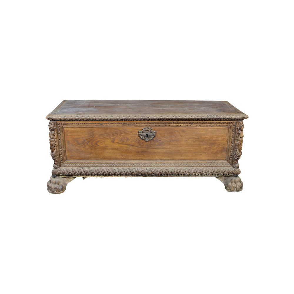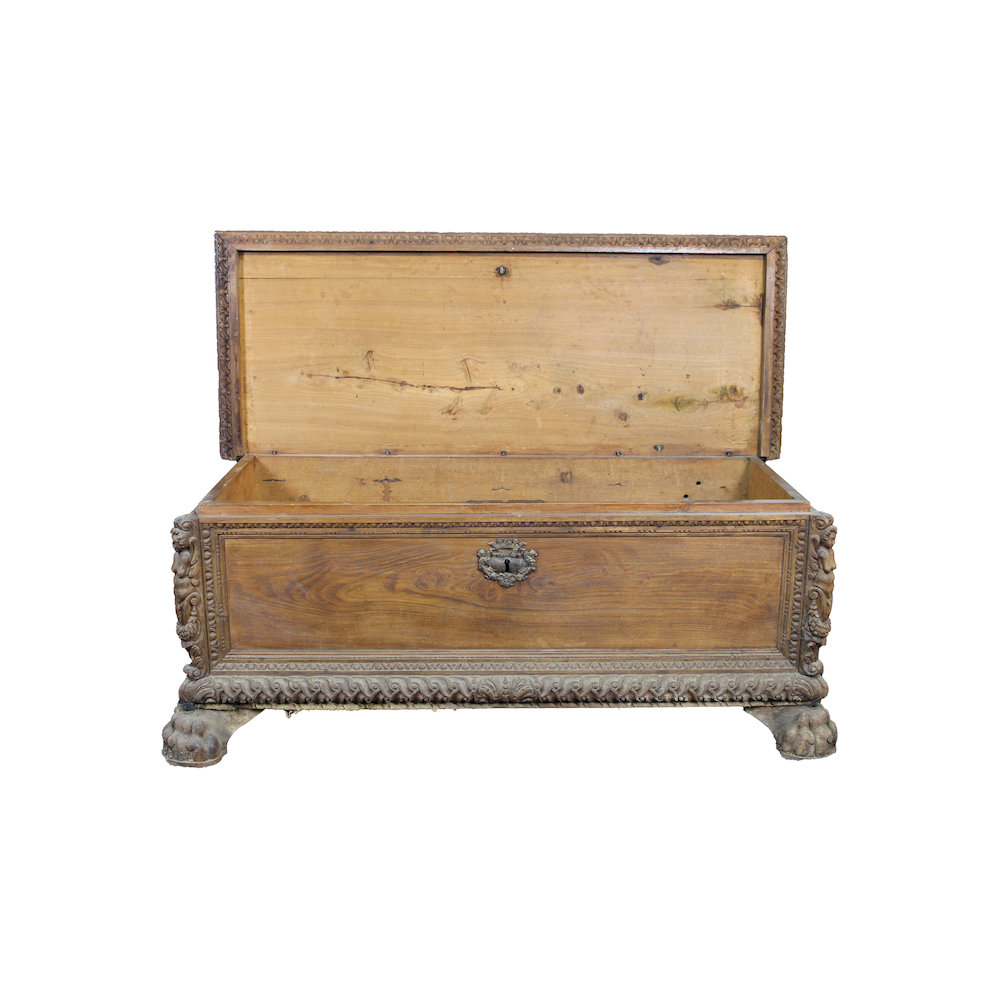 CASSAPANCA in legno di noce riccamente scolpita sorretta da gambe leonine Sicilia XVII/XVIII secolo h cm 60 x 142 x 60