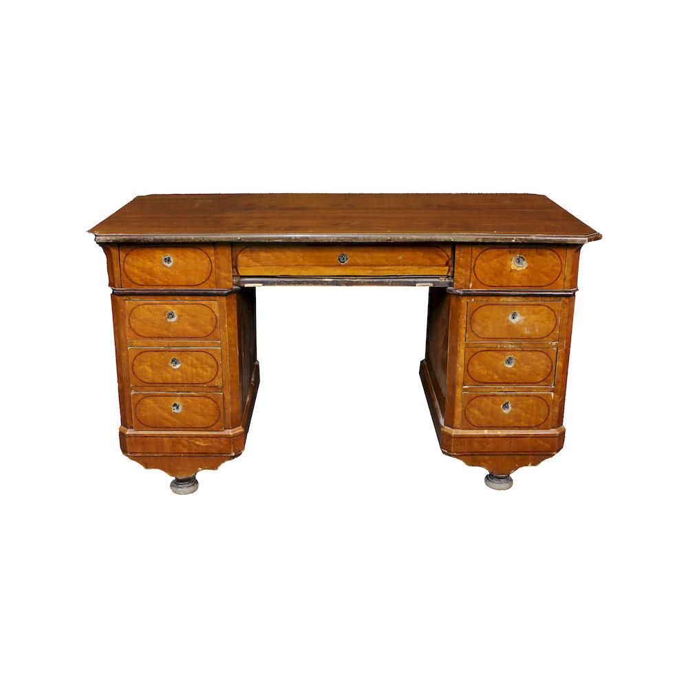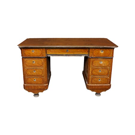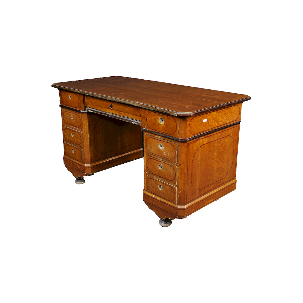 SCRIVANIA A SCAGNO CARLO X in legno di acero perfilata in Bois de rose e piano in noce a 8 cassetti nei laterali e 1 cassetto grande nella parte superiore Sicilia XIX secolo h cm 81 x 141 x 71
