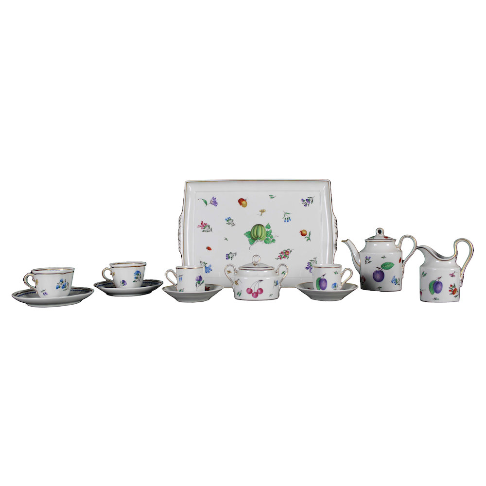 SERVIZIO TETE A TETE in porcellana dipinta a motivi floreali e frutta composto da vassoio, caffettiera, zuccheriera, 2 piattini e 2 tazzine di cui 1 sbeccata più 2 tazzine manifattura Richard Ginori misure varie