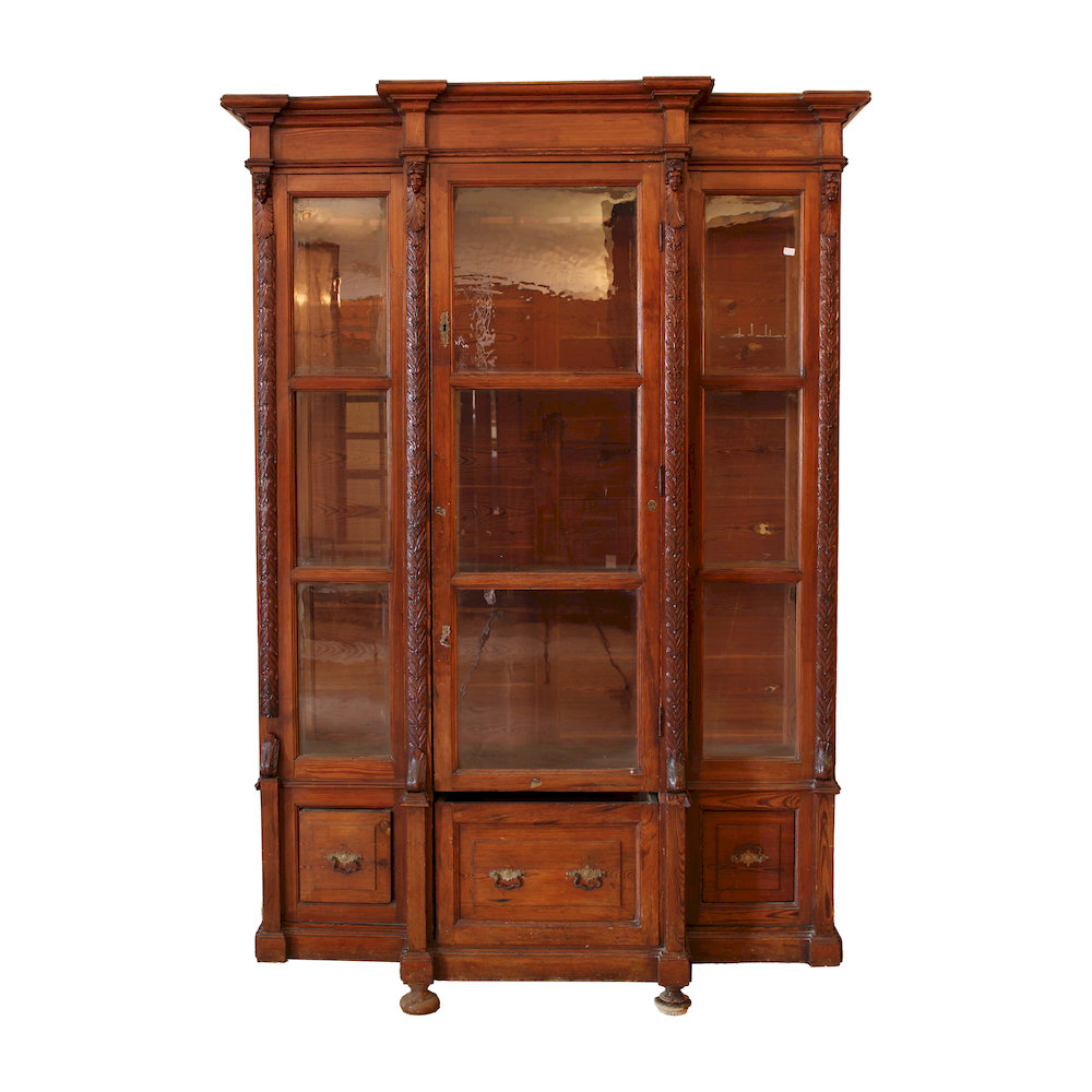 VETRINA A 3 ANTE di cui 2 fisse e 3 cassetti nella parte inferiore in legno di pino pece con lesene scolpite raffiguranti volti femminili Sicilia XIX secolo h cm 226 x 170 x 50