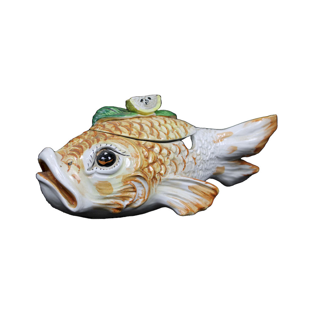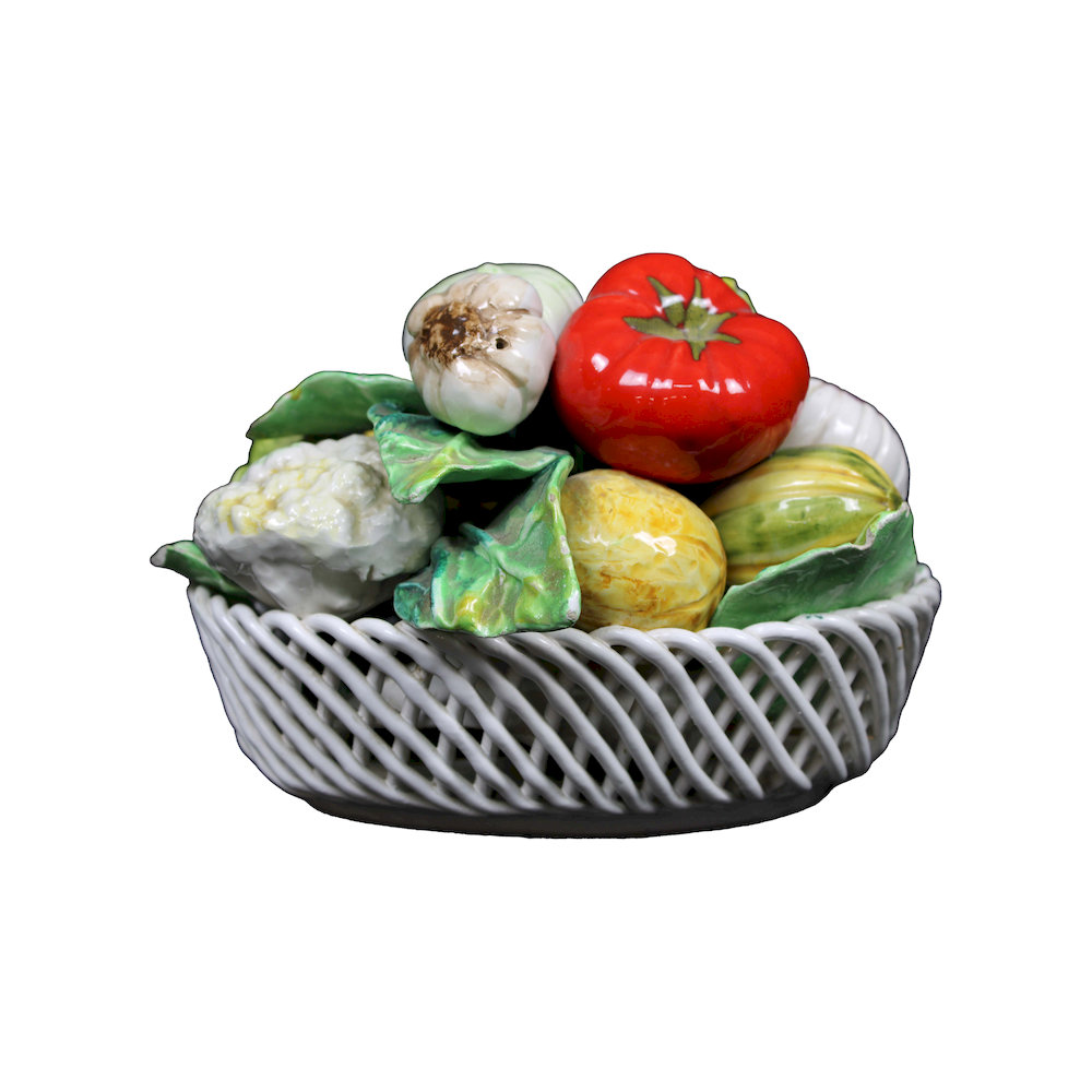 LOTTO COMPOSTO DA curiosa salsiera in maiolica raffigurante pesce manifattura Bassano primi 900' rotture alla coda e 1 composizione raffigurante cesto con ortaggi h cm 12 x 30 / h cm 14 x 21