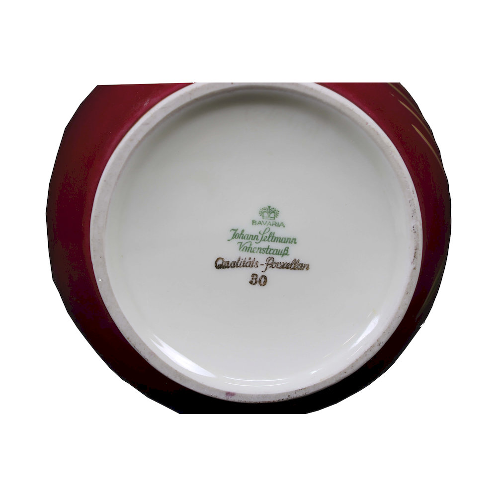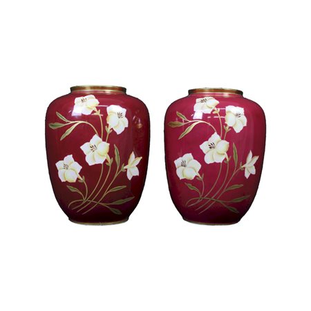 COPPIA VASI in porcellana a fondo rosso con decorazioni floreali e lumeggiature in oro Bavaria XX secolo h cm 22 x 18