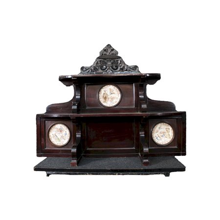 ELEMENTO DI PIATTAIA in legno di mogano arricchita da piatti in porcellana manifattura Sarreguemines du cui uno rotto Sicilia XIX secolo h cm 110 x 150 x 31