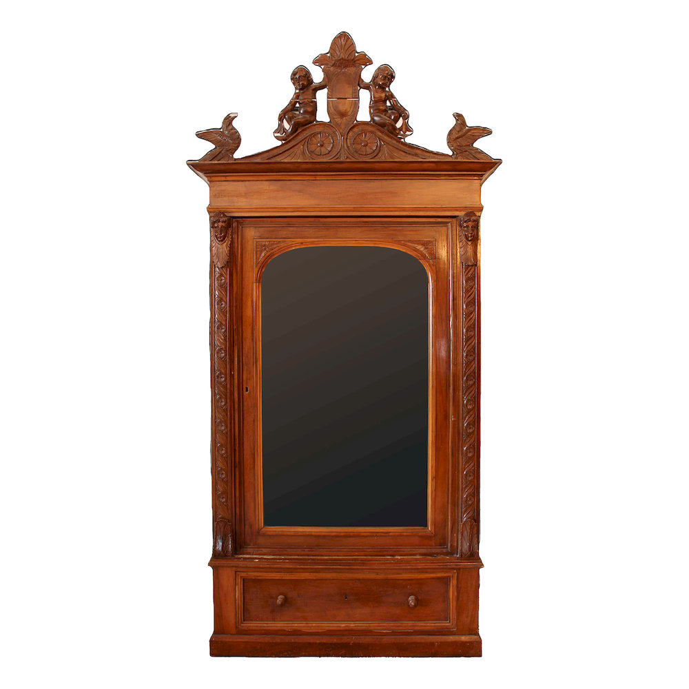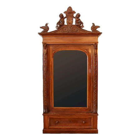ARMADIO in legno di noce riccamente scolpito ad un anta a specchio e 1 cassetto maestranze siciliane XIX secolo h cm 270 x 133 x 60