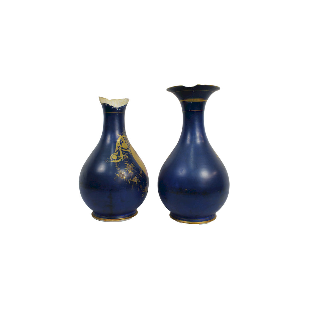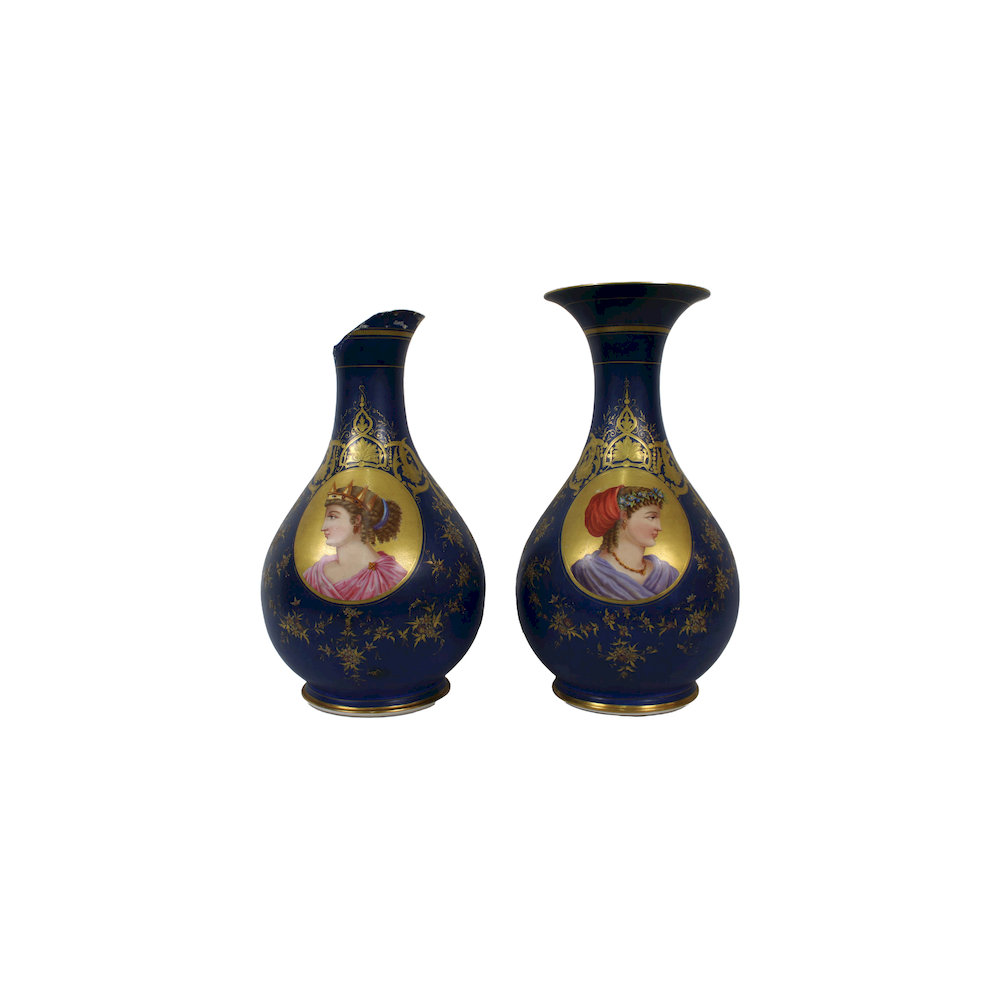 LOTTO COMPOSTO DA 2 vasi in porcellana a fondo blu cobalto dentro riserva raffigurante figure femminili e lumeggiate in oro, rotture e mancanze Francia XIX secolo h cm 43 x 26