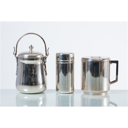 Tre contenitori termici in metallo cromato, uno con corpo sagomato, manico rigido semicircolare, decori sui fianchi. Uno con corpo cilindrico. Uno con corpo cilindrico e manico laterale. Segni di uso. Marchio di produzione.
