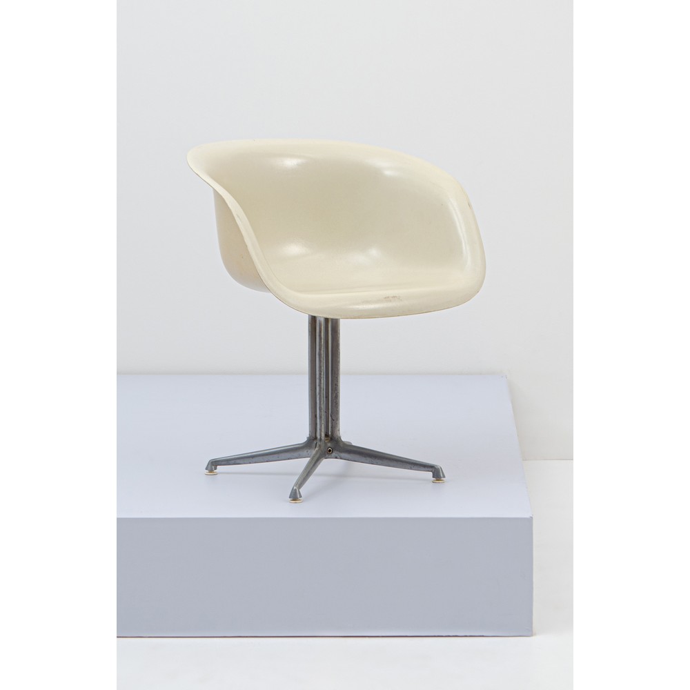 Poltrona modello “La Fonda” con struttura in alluminio, scocca in fibra di vetro bianca. Segni d’uso sulla scocca e sule parti metalliche. Etichetta di produzione.