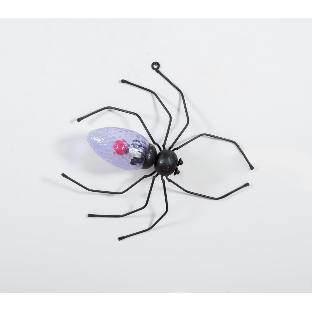 Lampada da parete ad una luce "Ragno", struttura in tondino di rame, diffusore a goccia in vetro stampato viola. Ossidazioni.