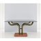 Tavolo da pranzo con struttura tubolare curvata, base in marmo, piano in vetro fumè.