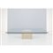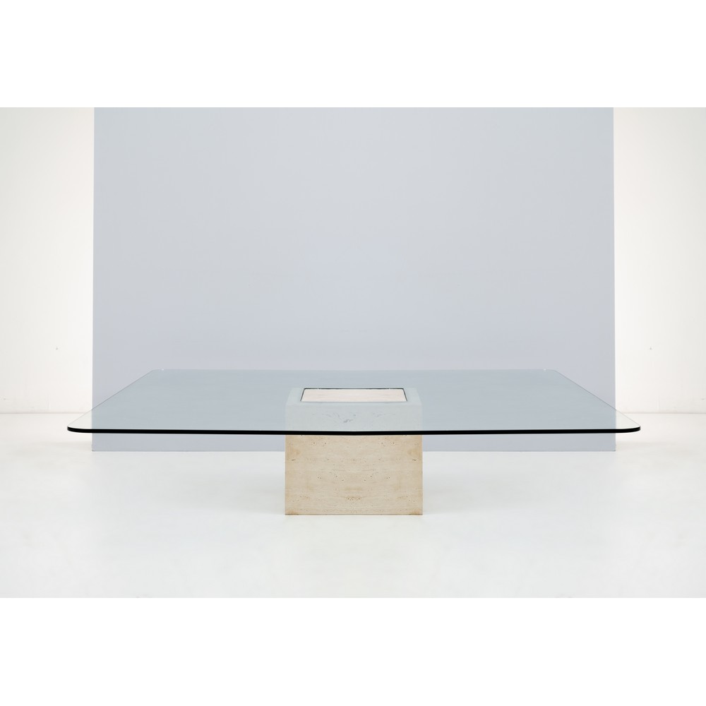 Tavolo da salotto Besnate, piede in marmo travertino, piano quadrato in cristallo trasparente. Sbeccatura al cristallo.