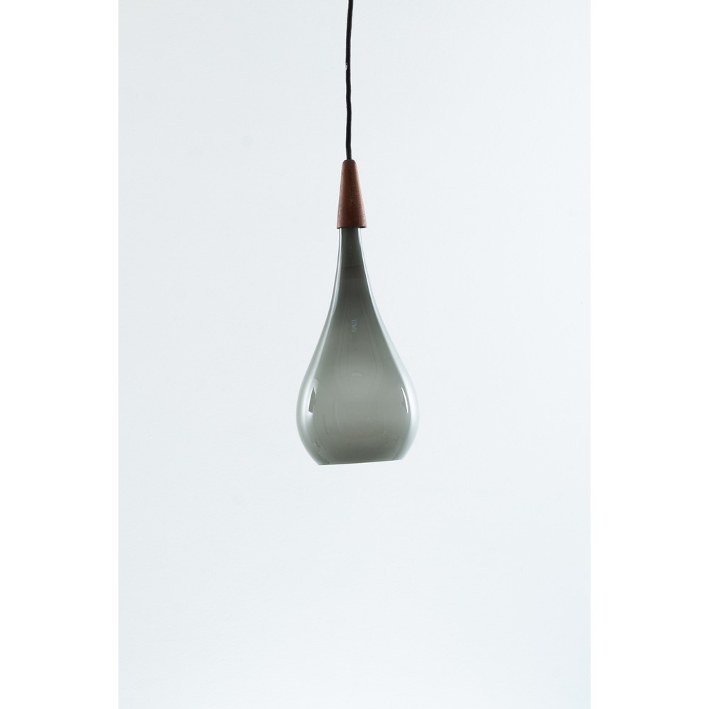 Lampada sospesa ad una luce con diffusore a goccia in vetro opalino grigio, cono di giunzione in legno. Cavo elettrico originale. Segni del tempo e piccola caduta di colore sulla coppetta di chiusura superiore.