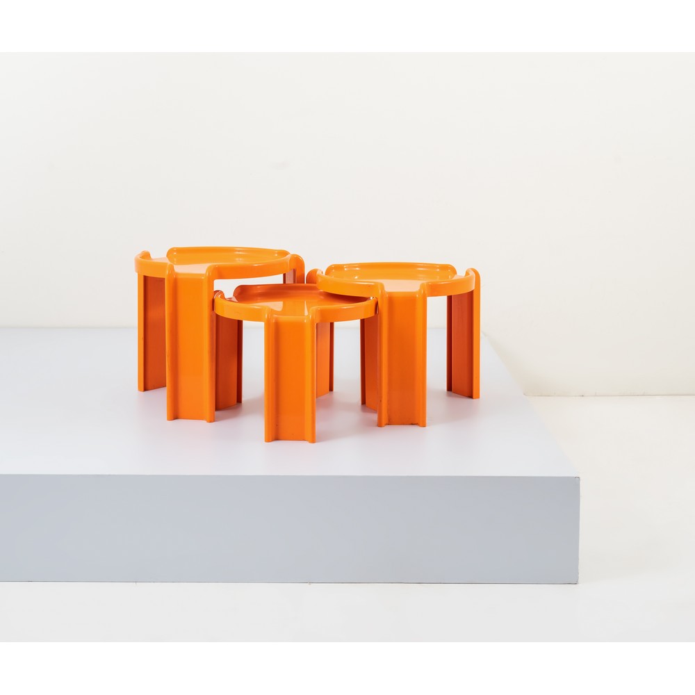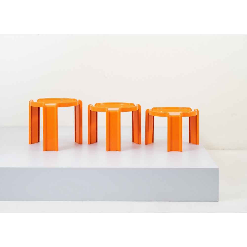 Tre tavoli in plastica arancione impilabili, piano circolare, tre gambe. Marchio di produzione.