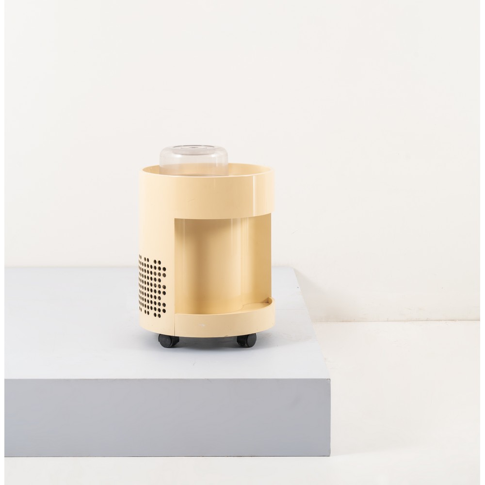 Frigo aperitivo "Space Age" con corpo cilindrico refrigerato e ruote, alluminio, coperchio abs trasparente.