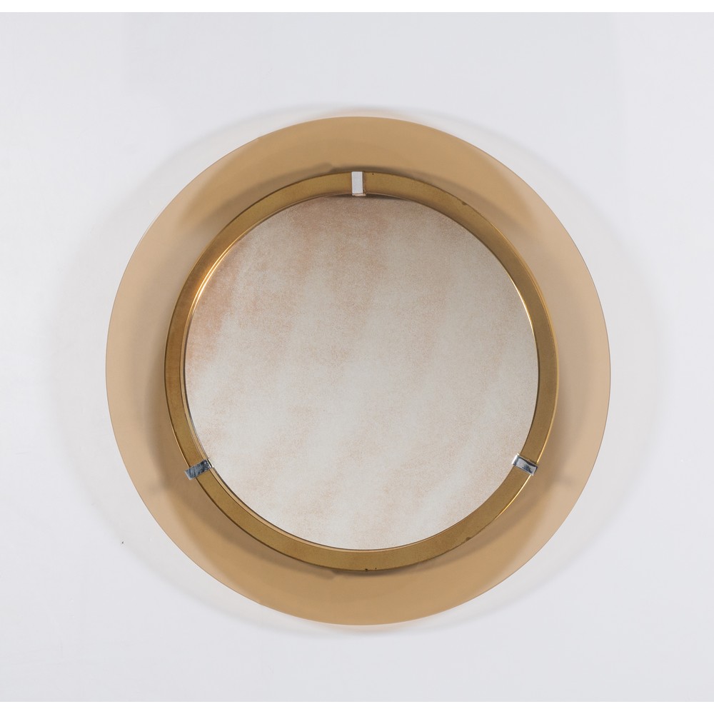 Specchio da parete circolare, struttura metallo, cornice in cristallo fumè, cristallo specchiato, minuterie in metallo cromato.