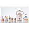 Sette oggetti in ceramica invetriata e decorata in policromia con volti, decori geometrici e fiori, un fiasco, due bicchieri, due campanelle, un piccolo vaso ed una bottiglia panciuta. Firma e data retrostante.