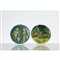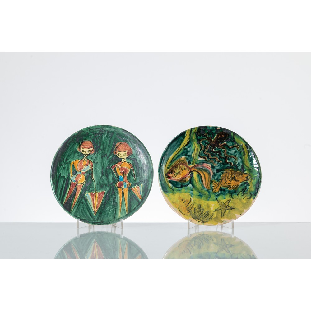 Due piatti circolari in ceramica invetriata e decorata in policromia, uno con figure di pesci ed uno con figure femminili. Lievi sbeccature. Firma retrostante.