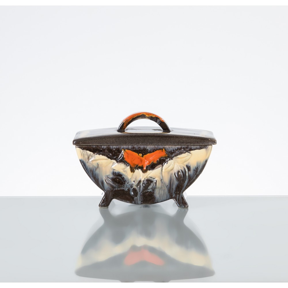 Biscottiera in ceramica invetriata nera e decorata con motivi vegetali a rilievo e smaltati in giallo e rosso, coperchio curvato con presa rossa. Numero di produzione.