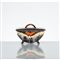 Biscottiera in ceramica invetriata nera e decorata con motivi vegetali a rilievo e smaltati in giallo e rosso, coperchio curvato con presa rossa. Numero di produzione.