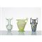 Tre vasi da collezione, uno in vetro trasparente con filigrane verdi e celesti, anse ricurve applicate. Uno in vetro scavo verde con ansa applicata. Uno in vetro blu con decoro di murrine policrome, anse applicate in vetro blu.