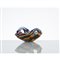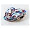 Centrotavola in vetro arlecchino, verde, blu, rosso e lattimo, corpo a paniere con due manici laterali.