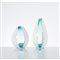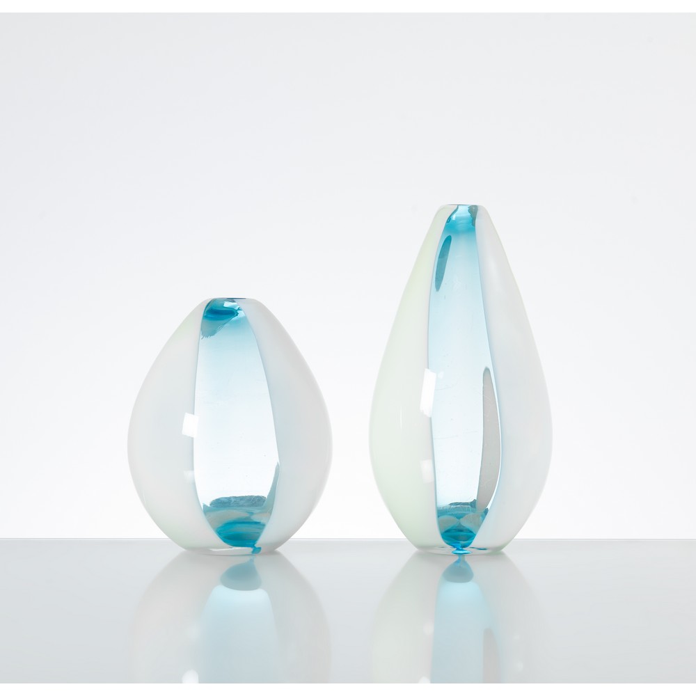 Due vasi di altezza differente in vetro a sfumare, corpo a goccia decorato con larghe fasce orizzontali lattime, verdi e azzurrino, piccola bocca circolare piana.
