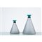 Due bottiglie di grandezza differente in vetro satinato, corpo a cono con collo nero e verde, bocca piana circolare.