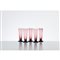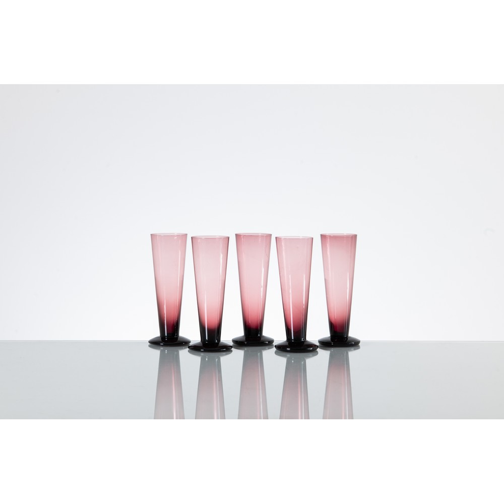 Cinque flutes in vetro lilla, corpo a pantalone con bocca piana circolare, base circolare.