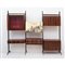 Libreria con struttura in metallo verniciato nero ed ottone, tre elementi cosi suddivisi: un vano in legno esotico con due ante battenti in vetro e metallo, mensola sovrastante; vano centrale in legno esotico con mobile bar ad un'anta a ribalta decorata con paesaggio serigrafato, interno in vetro, vano sottostante con quattro cassetti in legno esotico; due vani in legno esotico con due ante battenti. Segni d'uso, lievi difetti alle parti lignee.