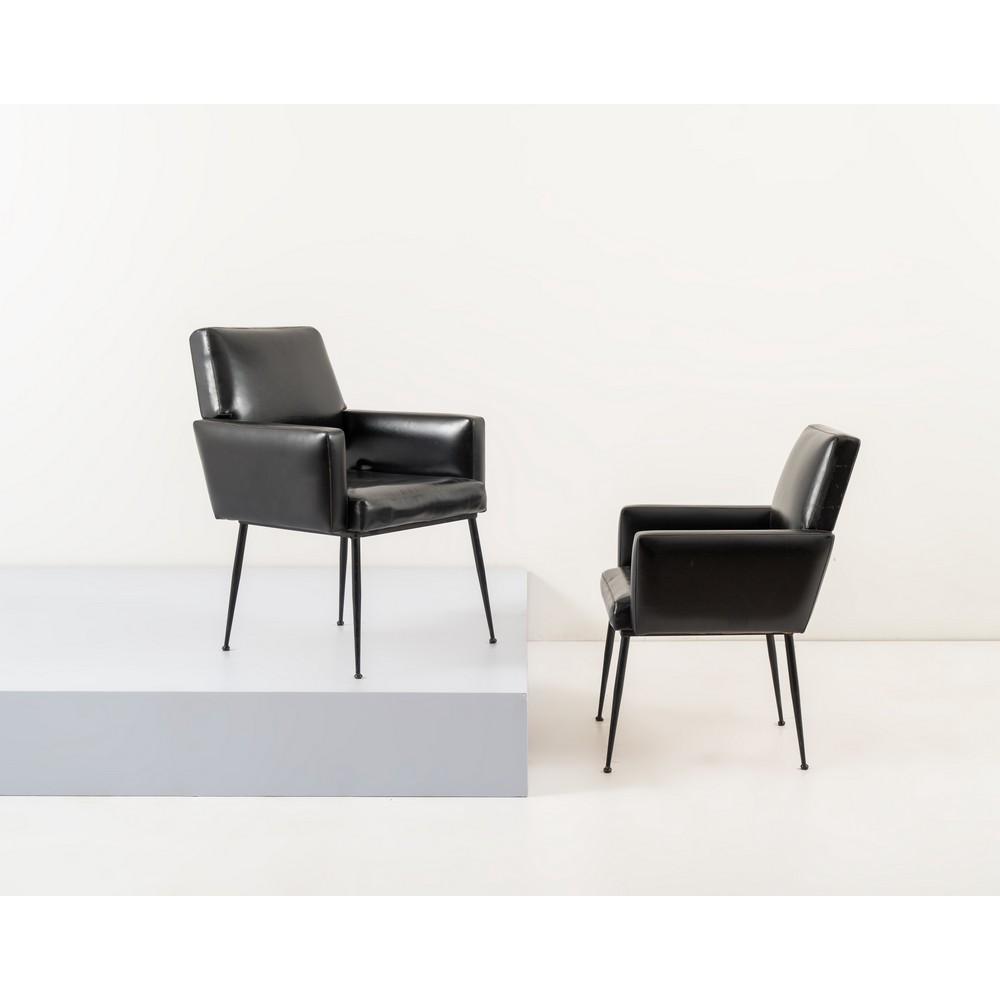 Coppia di poltrone con struttura in metallo verniciato nero, seduta, braccioli e spalliera con imbottitura e rivestimento in skai nero, lievi graffi e segni di uso.