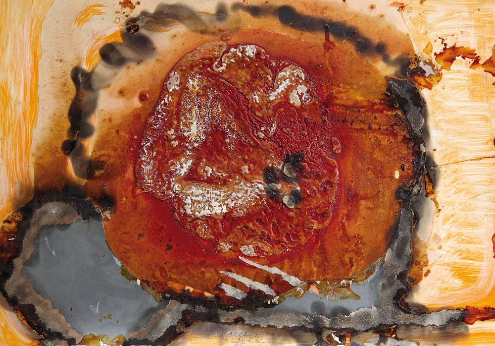 combustione e tecnica mista su cartone cm. 35x50, firma e anno in basso al centro, etichetta della Galleria Arte Vinciguerra (Bellona) su foto.