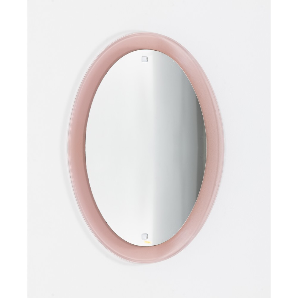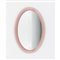 Specchio da parete ovale, cornice in plexiglass rosa, struttura in metallo, cristallo specchiato ovale, minuterie in metallo cromato.
