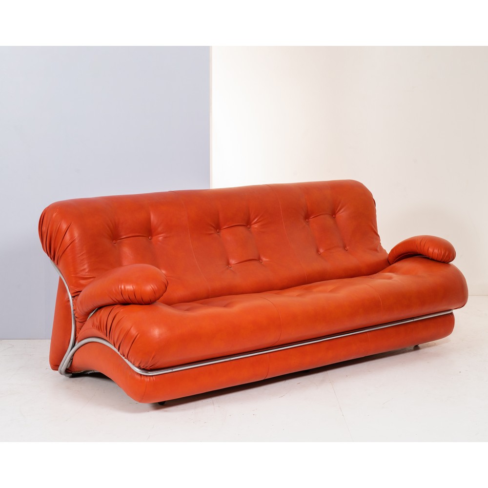 Divano a tre posti con struttura in acciaio cromato, imbottitura e rivestimento in pelle marrone. Usure, pelle della seduta con difetti e ricoloritura, lievi ossidazioni. Marchio di produzione.