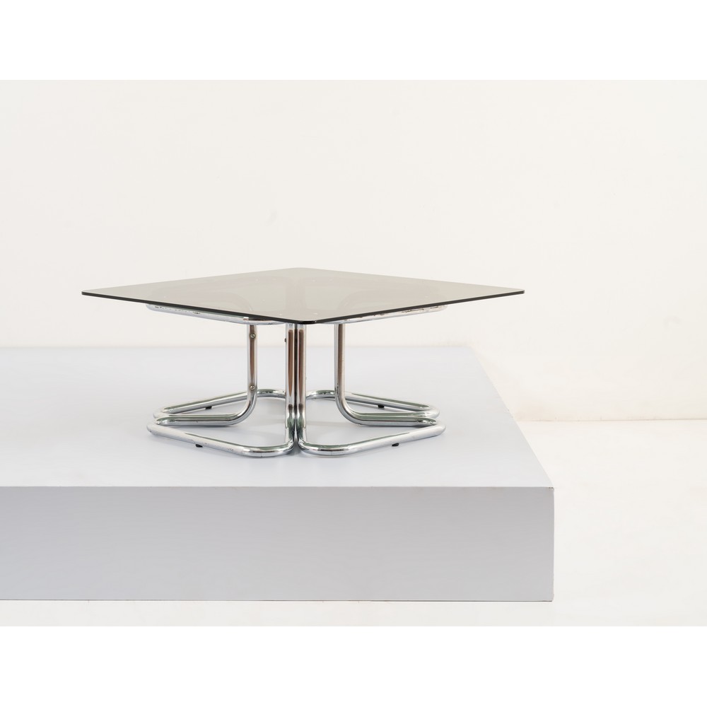 Tavolo da salotto con struttura in tubolare in metallo cromato, piano quadrato in vetro fumè con angoli arrotondati.