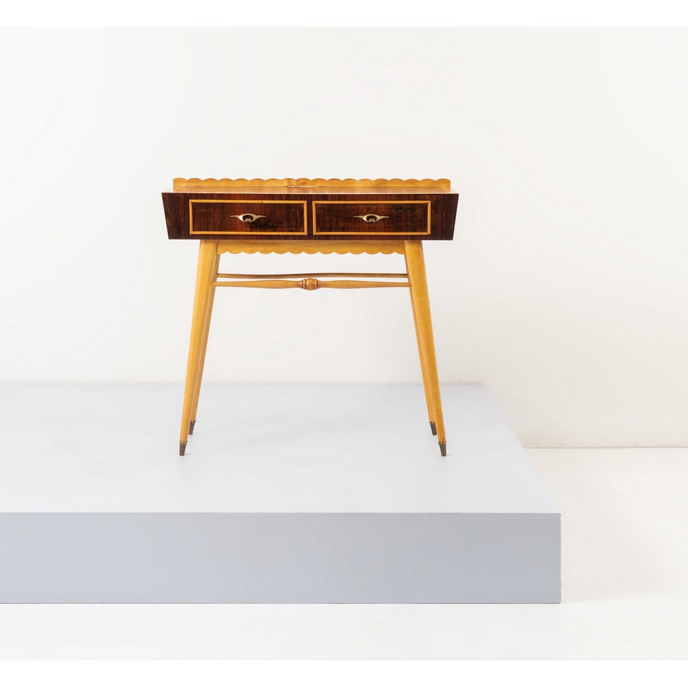 Consolle con struttura in legno esotico e legno di faggio, piano rettangolare, sul fronte due cassetti con maniglie in ottone, alzata e grembiule in legno sagomato ad onde, crociera in legno tornita, scarpette coniche in ottone, segni di uso.