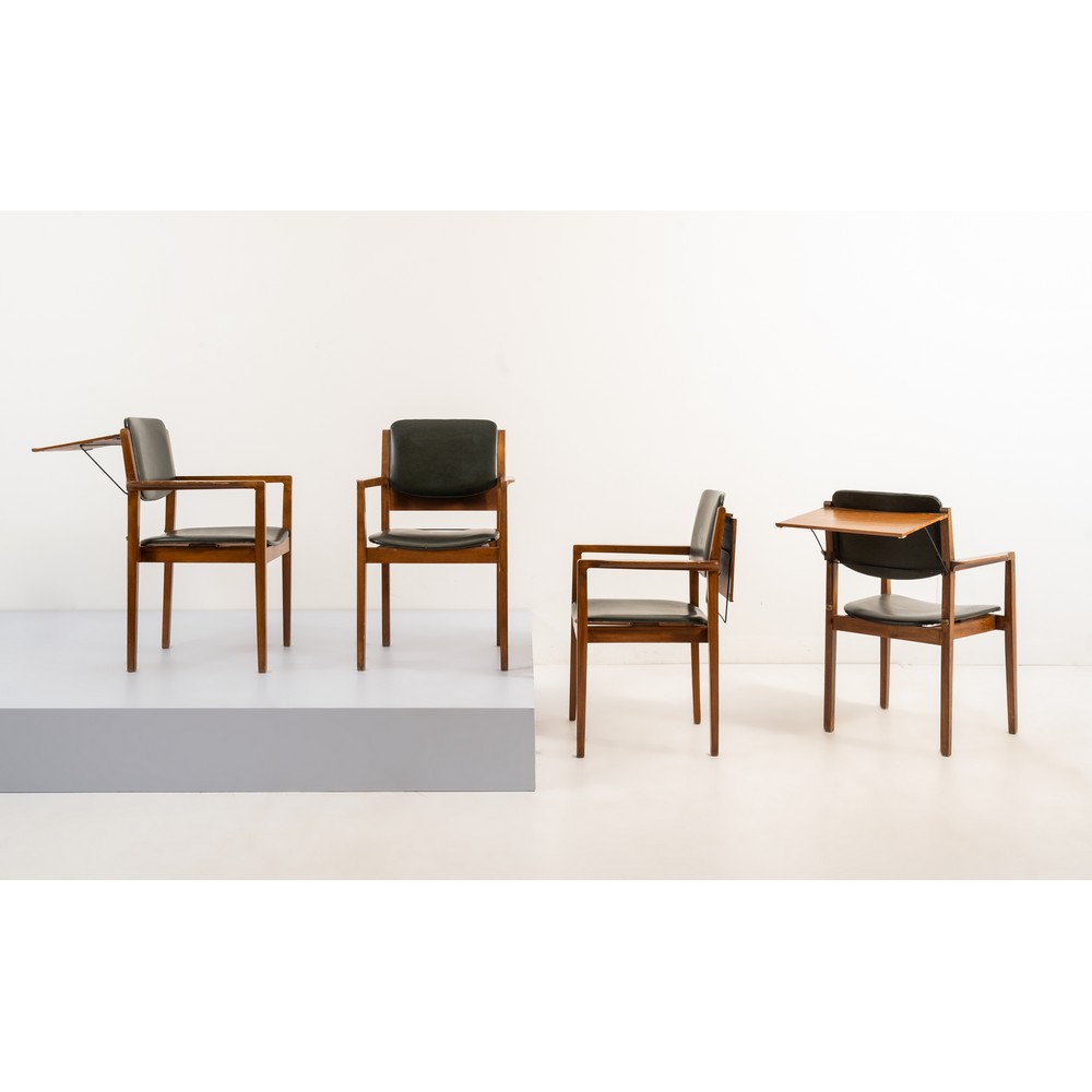 Quattro poltrone con struttura in legno, spalliera e seduta con imbottitura e rivestimento in sky nero, dietro la spalliera piano/scrittoio ribaltabile, minuterie in metallo verniciato. Segni di uso.