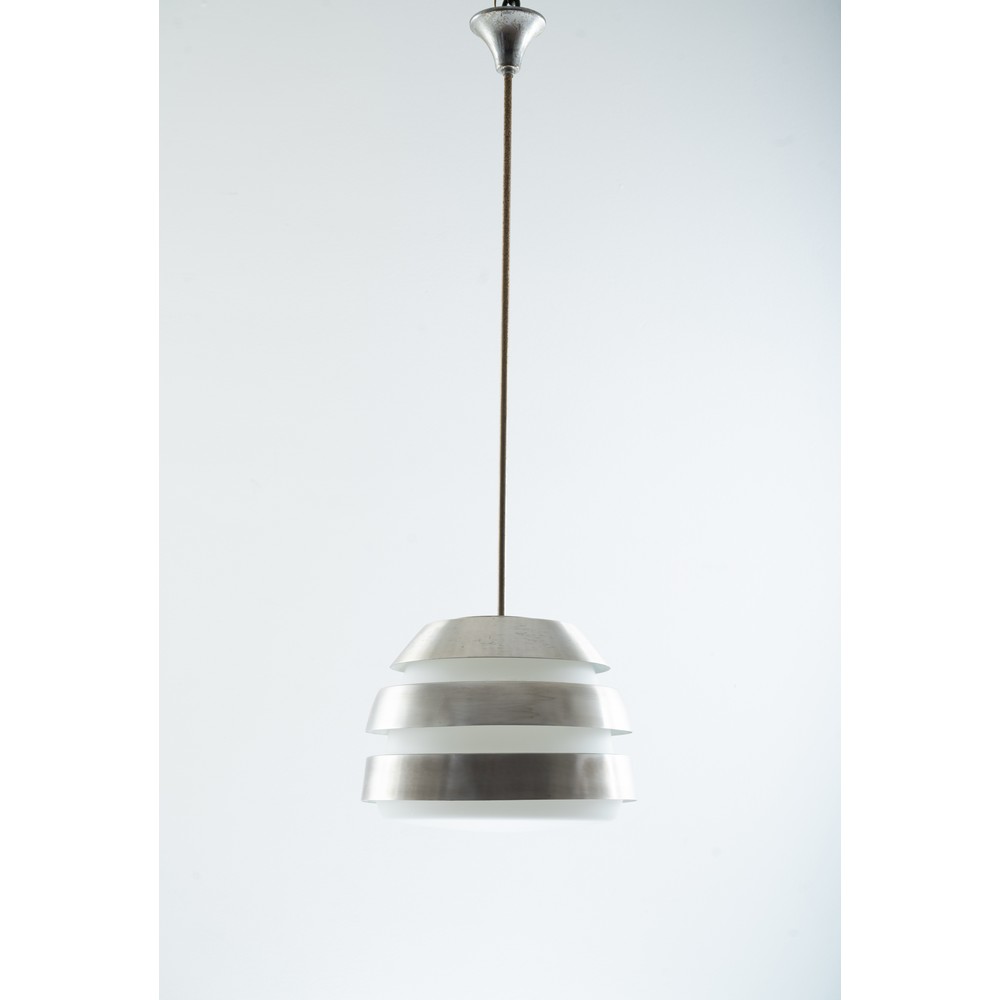 Lampada a sospensione ad una luce, diffusore a campana in vetro opalino e fasce orizzontali in alluminio. Lievi graffi.