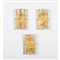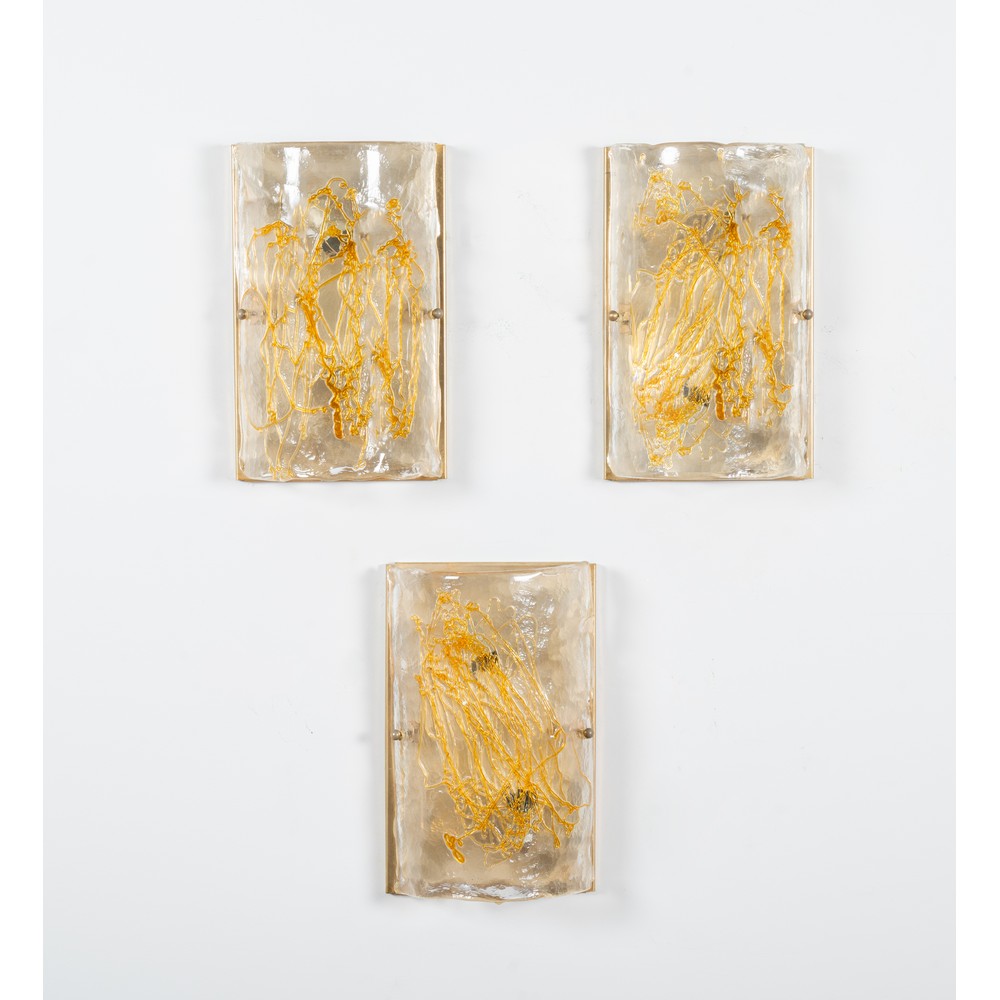 Tre lampade da parete ad una luce, struttura in metallo dorato, diffusore curvato in vetro corteccia decorato con filamenti in vetro ambra. Marchio di produzione.