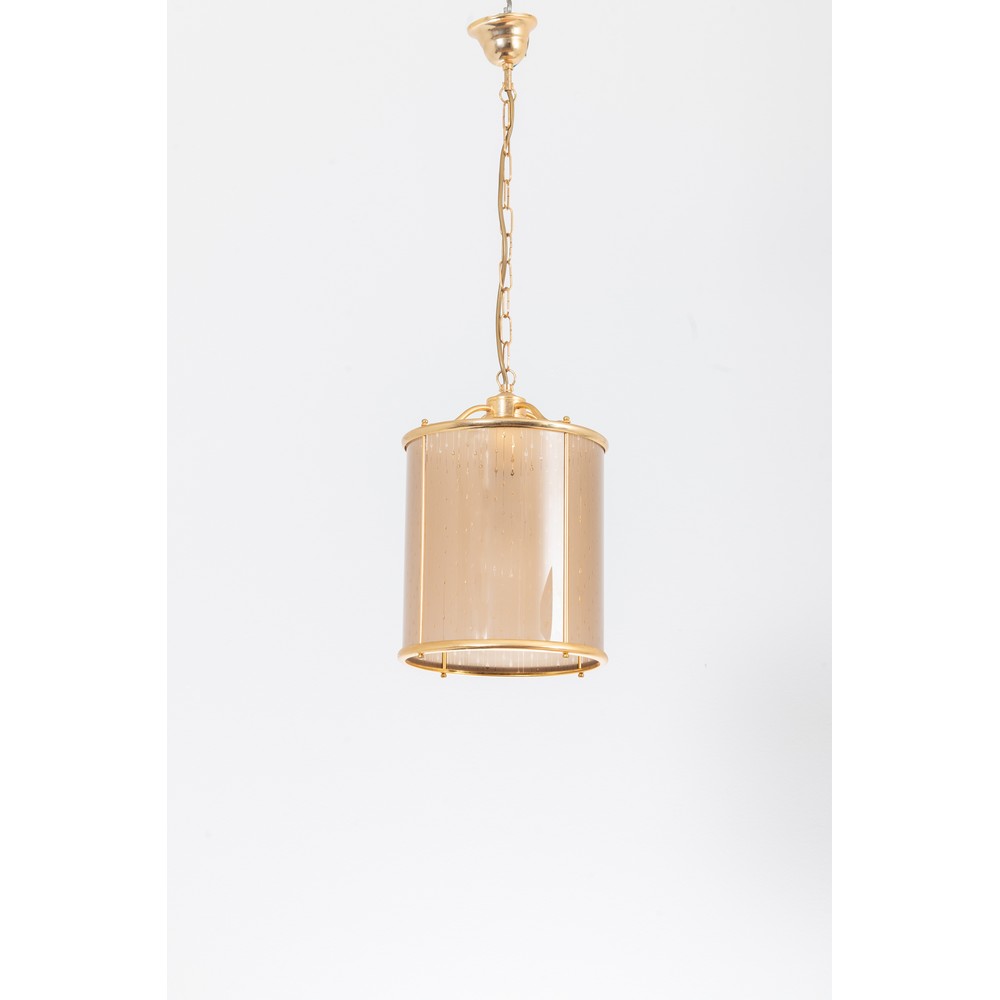 Lampada a sospensione ad una luce "Lanterna", struttura in metallo dorato, corpo cilindrico, diffusore in vetro fumè decorato con gocce in trasparenza.
