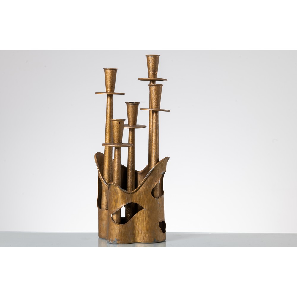 Candeliere a cinque fiamme in peltro dorato, base sagomata con bordo ondulato, canne coniche. Marchio di produzione incusso.