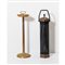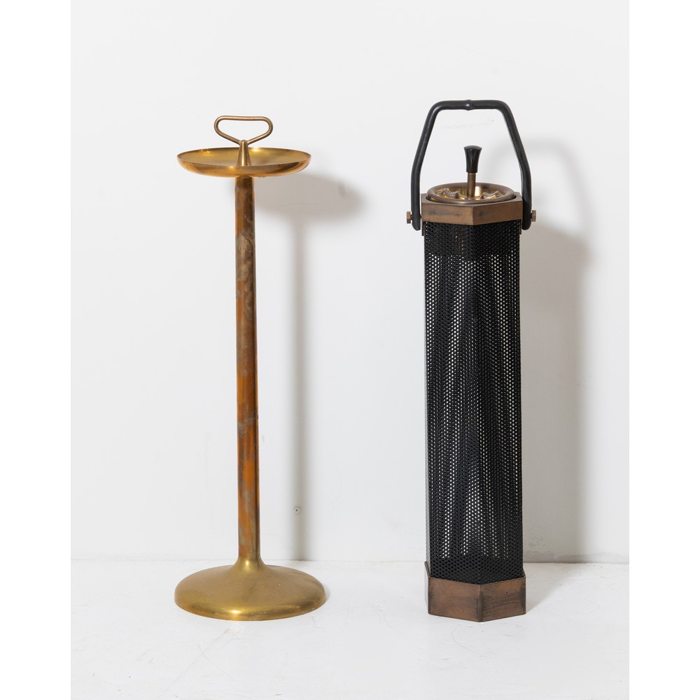 Posacenere in metallo dorato con piede circolare, stelo tubolare e coppa semisferica, impugnatura sagomata. Ossidazioni. Posacenere da terra con corpo esagonale, base superiore ed inferiore in ottone, corpo in metallo microforato e verniciato nero, cineriera circolare mobile, impugnatura sagomata nera.