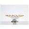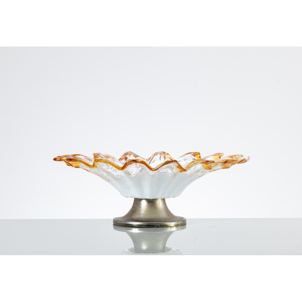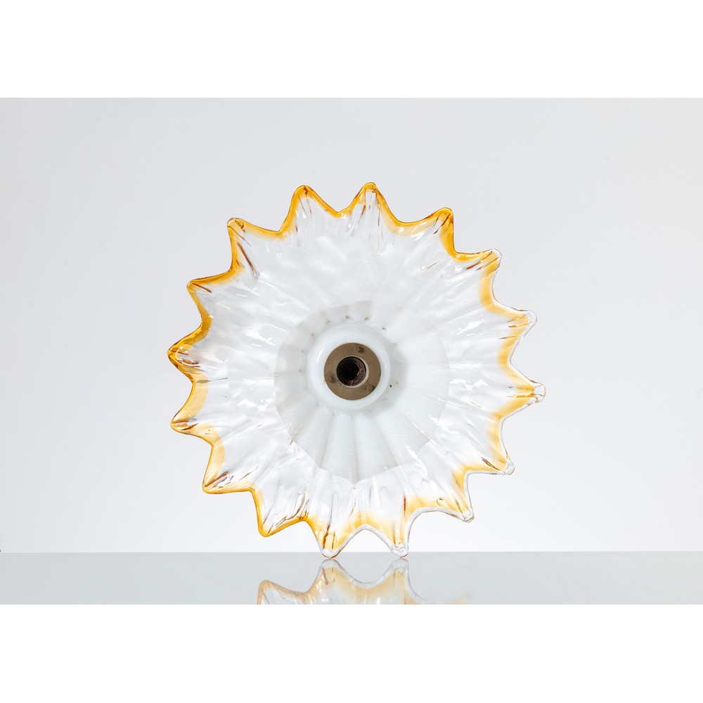 Lampada da tavolo ad una luce, struttura in metallo cromato, diffusore fitomorfo in vetro parzialmente incolore e lattimo, bordi ondulati in vetro ambra. Lievi ossidazioni.