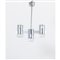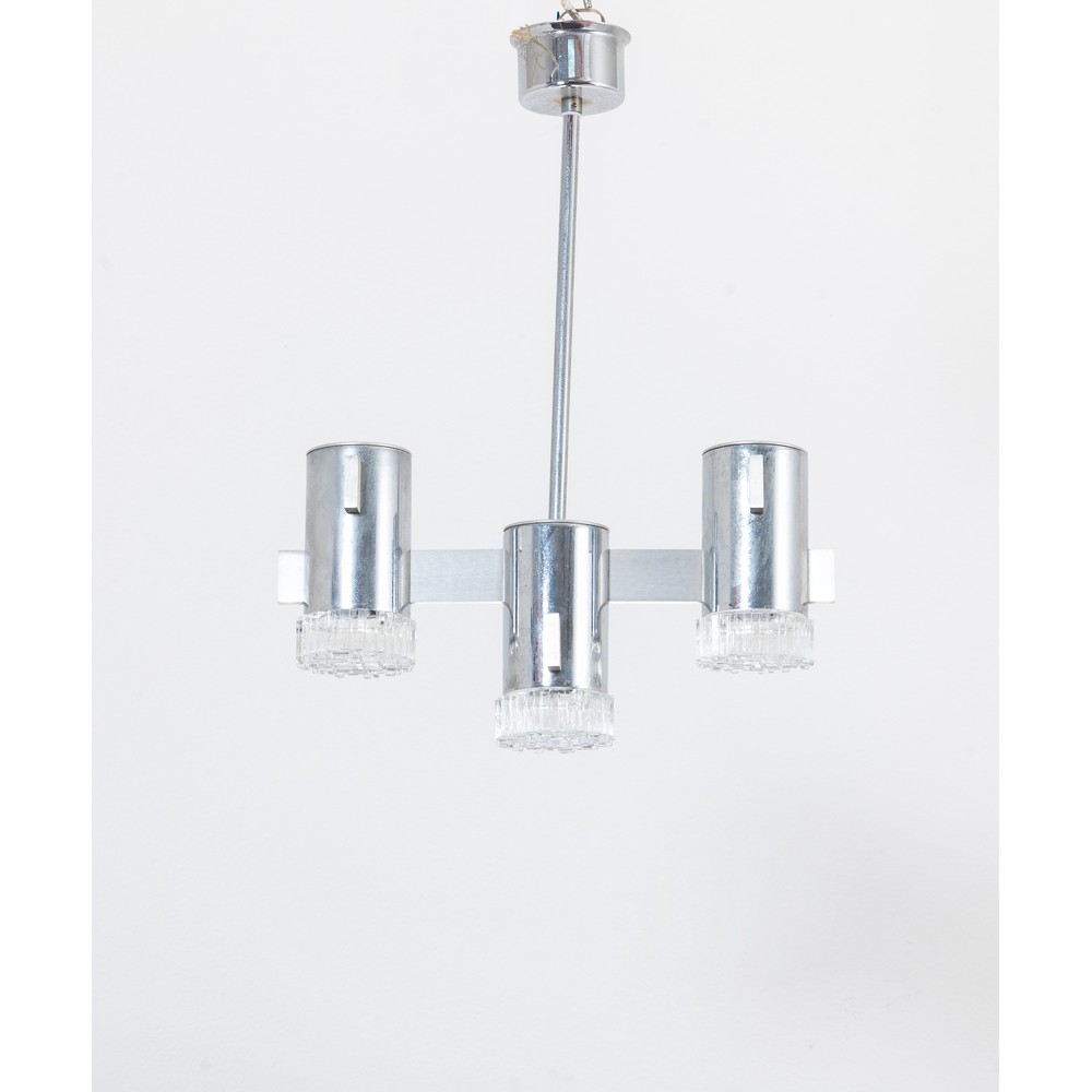 Lampada a sospensione con struttura in acciaio cromato, diffusori circolari in vetro incolore a stampo.