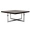 Tavolo da salotto con struttura in acciaio cromato, piede a crociera, piano quadrato in legno esotico.