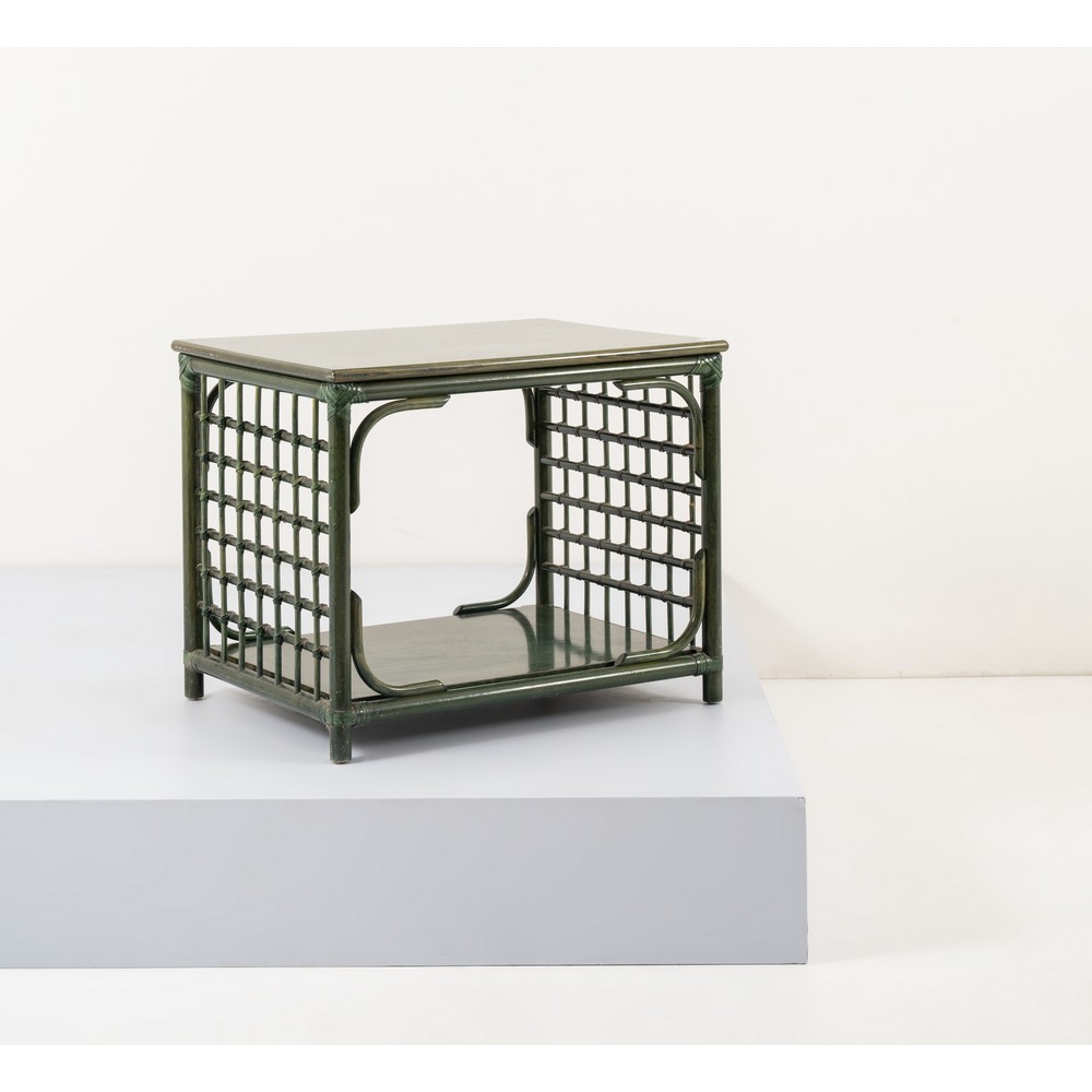 Tavolo basso in canna di bamboo verde e midollino, fianchi con intreccio a quadrati, due piani rettangolari in legno verde.