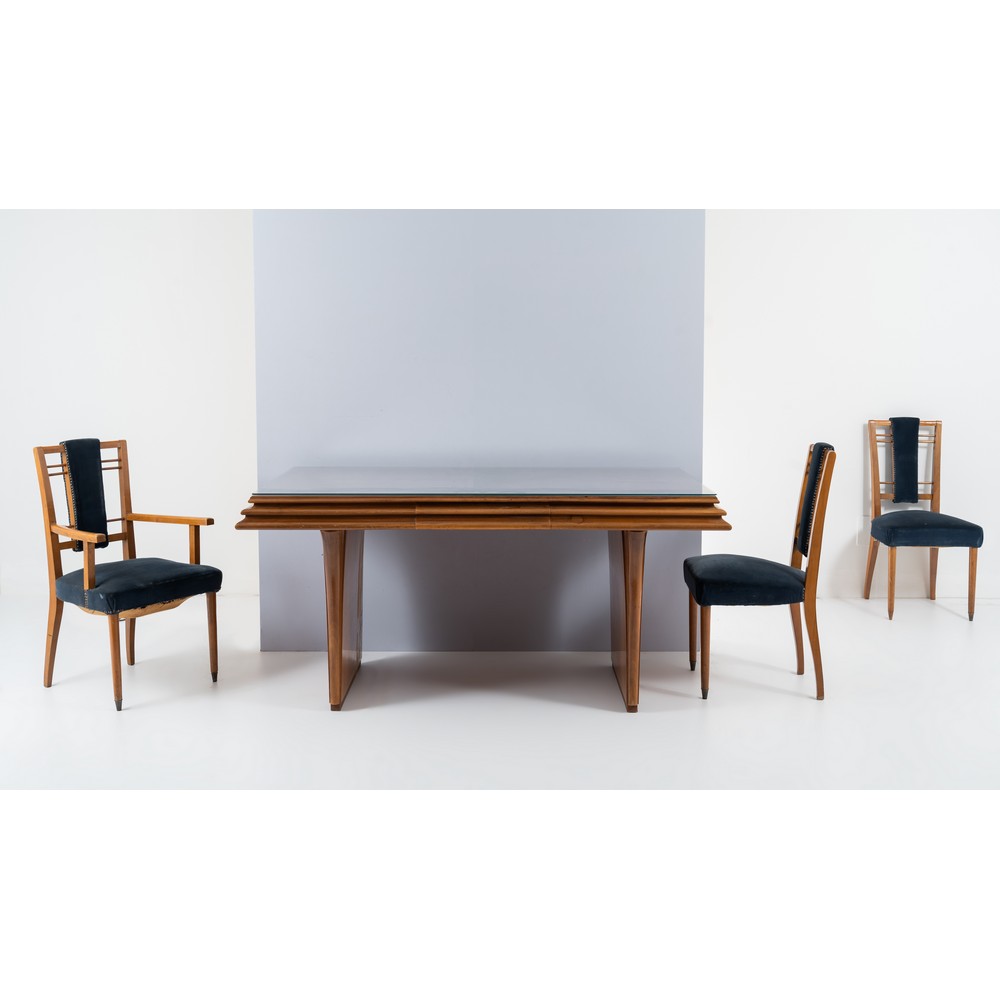 Scrivania in legno massello, piano rettangolare con tre sagomature laterali, piano rettangolare con vetro incolore, fianchi a pannello unico; una poltrona e due sedie in legno con parte della spalliera e la seduta imbottite e rivestite con velluto blu. Segni di uso e lievi graffi.